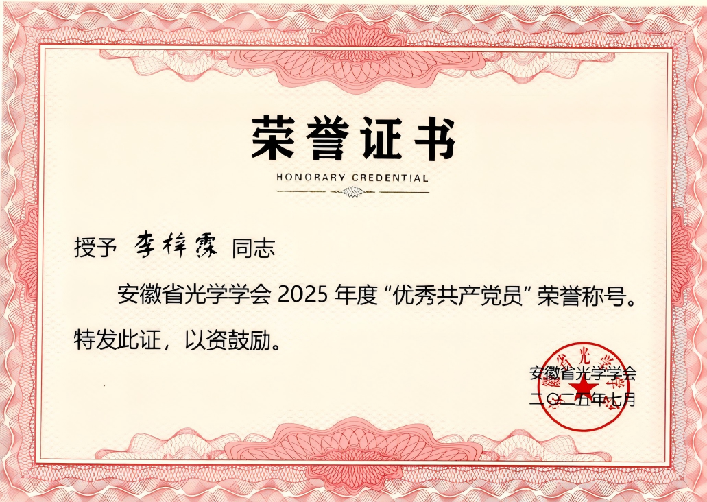 在庆祝中国共产党成立104周年之际,安徽省光学学会公布了“2025年度安徽省光学学会优秀共产党员”评选结果。经推荐与评审,beat365官网电子信息工程学院李梓霂老师凭借在专业领域的卓越贡献与先锋模范作用,获评“2025年度安徽省光学学会优秀共产党员”荣誉称号。