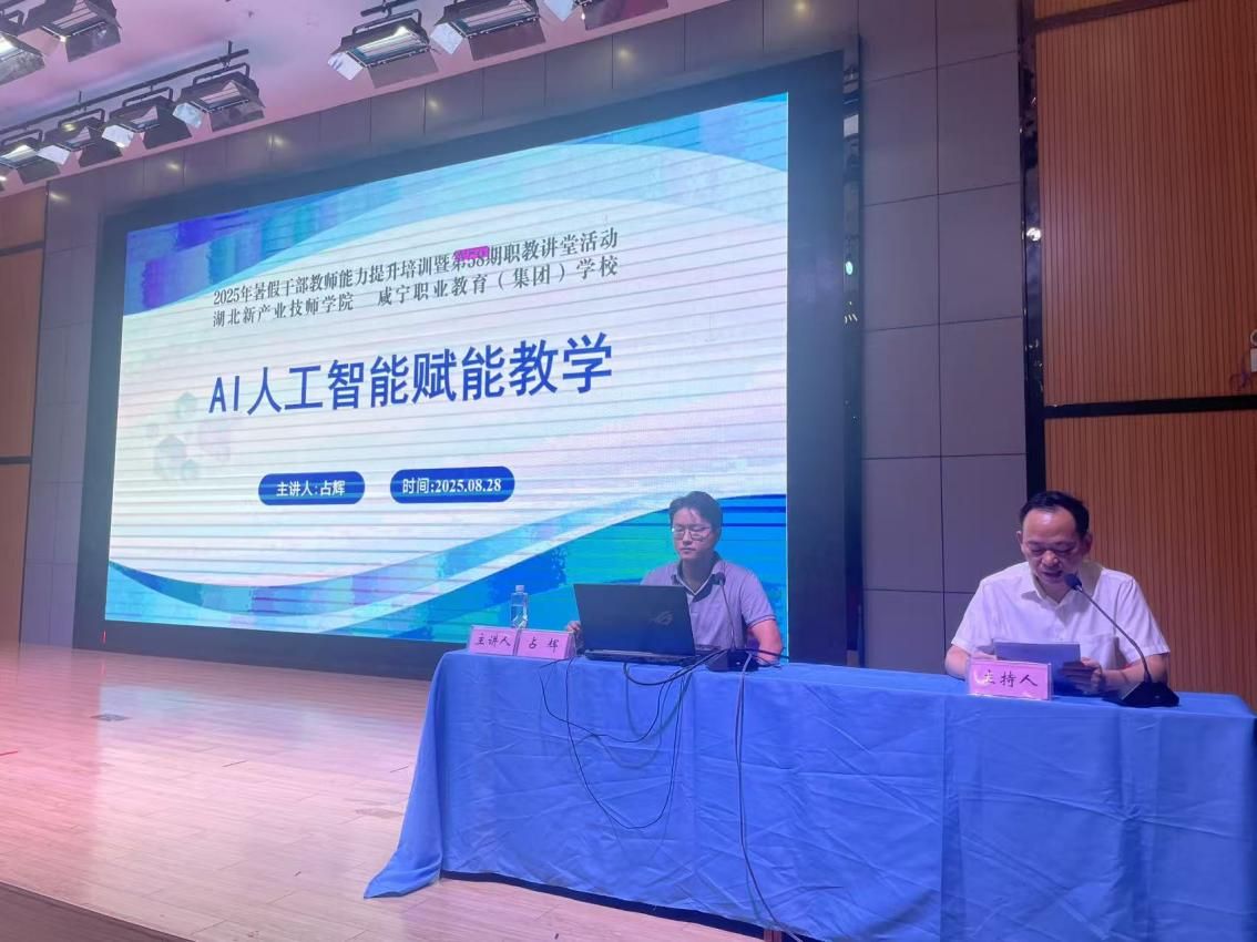 近日,beat365英国官网网站占辉老师受邀走进咸宁职业教育(集团)学校,在 该校“2025年暑假干部教师能力提升培训暨第58期职教讲堂活动”中,作“AI 赋能教学创新”专题讲座,为200余名干部教师讲授兼具理论高度与实操价值的AI应用知识与技能,讲座成果获主办方高度认可。