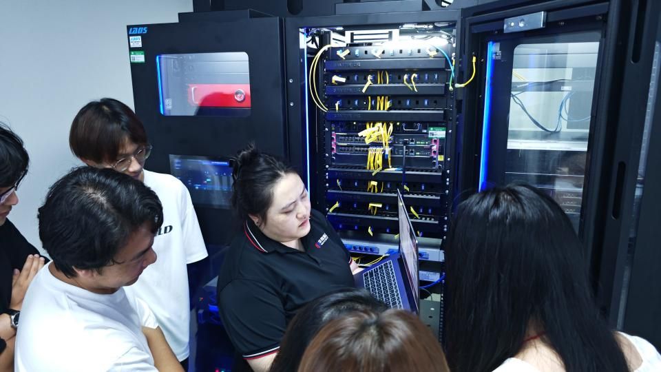 在专业讲师带领下,同学们以 8-10人 为小组,有序深入理解数字信息实训中心网络核心功能区。讲师们立足数字化建设真实应用场景,结合自身行业实践经验,为同学们进行了细致入微的现场讲解与生动直观的操作演示。讲解内容从宏观层面的网络架构设计原理,到微观层面的核心机房恒温恒湿运维环境、设备线路连接规范,再到具体的接入设备调试技巧与故障排查方法,每一个操作步骤、每一台专业设备都成为鲜活的教学案例。同学们全程兴致高昂,专注聆听讲解的同时,主动围绕技术难点、行业应用痛点等问题与讲师展开深入互动交流,现场学习氛围浓厚热烈,知识碰撞火花四溅。