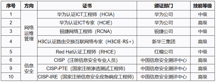 学生在校期间可以考取华为HCNA/HCNP/HCIE认证和红帽RHCSA/RHCE/RHCA认证,1+X网络安全应急响应职业技能等级证书、H3C认证路由交换网络工程师证书、CISP注册信息安全专业人员证书。