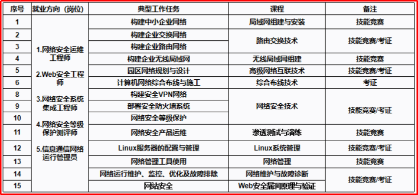 Python应用开发、路由交换技术、网络数据库技术应用、Linux 操作系统管理、高级网络互联技术、Web安全漏洞原理与验证、信息网络布线、渗透测试与演练、SDN技术、网络安全攻防对抗、网络系统集成、无线局域网组建、企业安全运维、网络安全等级保护等。